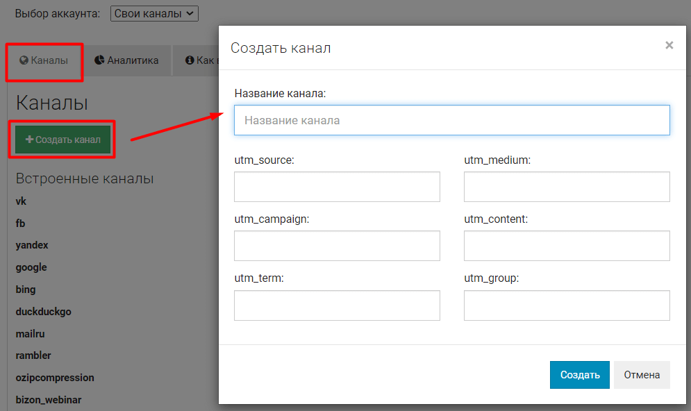 Во вкладке Каналы нажмите на зеленую кнопку +Создать канал.