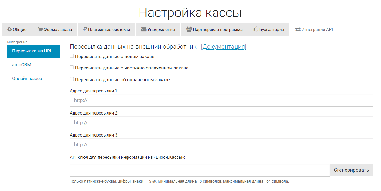 «Бизон.Касса» позволяет отправлять специальные сообщения другим системам (сервисам) по событиям "новый заказ", "частично оплаченный заказ" и "оплаченный заказ".