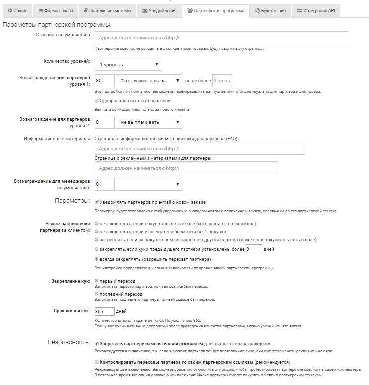 Cookies в браузере позволяют определить, переходил ли клиент по партнерской ссылке в данном браузере. Определите условия своей партнерской программы и в соответствии с ними выберите, как за клиентом будет закрепляться партнер и сколько будут храниться cookies. - Безопасность