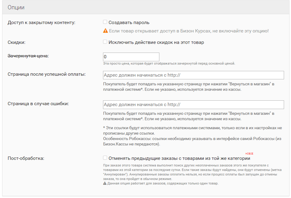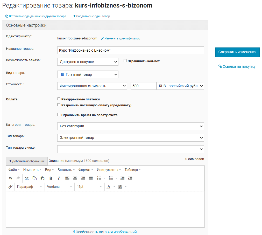 При создании нового товара автоматически открывается страница редактирования. Заполните поля и сохраните изменения. Настройки будут всегда доступны для редактирования. Однако учтите, что при смене идентификатора все ссылки на покупку товара меняются, а старые перестают работать.
