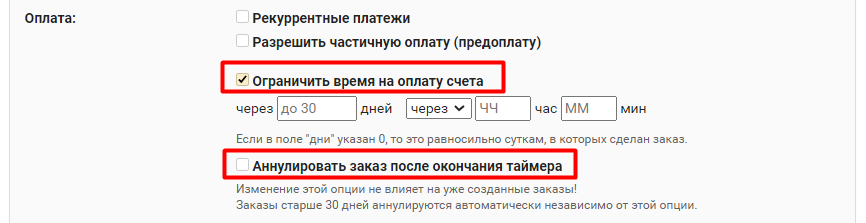 - Можно выставить обратный отсчет времени для оплаты заказа, а также выбрать опцию аннулирования заказа после окончания отсчета.