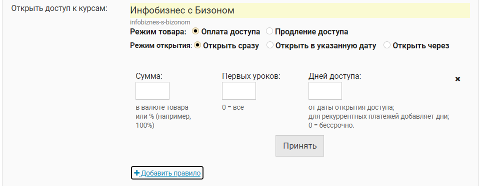Для курса можно задать одно или несколько правил, по которому будет открываться определенное количество уроков или ограничиваться срок доступа. А также установить сумму оплаты, при которой это правило сработает.