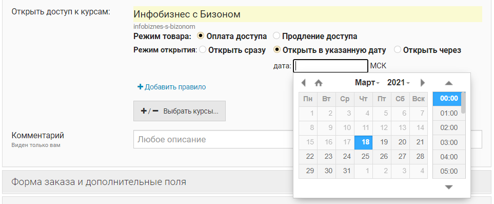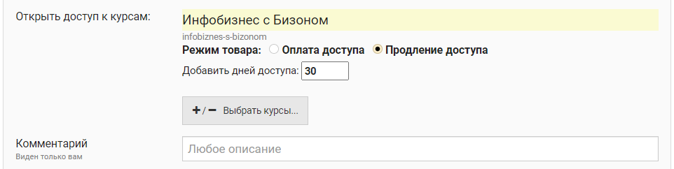 Для режима Продление доступа достаточно только указать количество дней, на которое продлевается доступ. А если выбран режим товара Оплата доступа, то настройки доступа продолжаются.