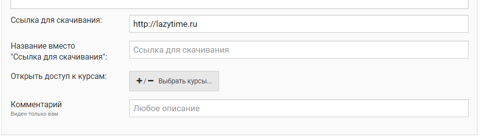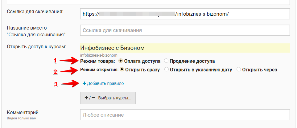 Если после оплаты товара должен открываться доступ к курсу, ссылку на скачивание указывать не нужно - поле заполнится автоматически после выбора курса. Нажмите на кнопку + / − Выбрать курсы. В открывшемся списке выберите нужный курс или курсы, поставив галочку рядом с названием.