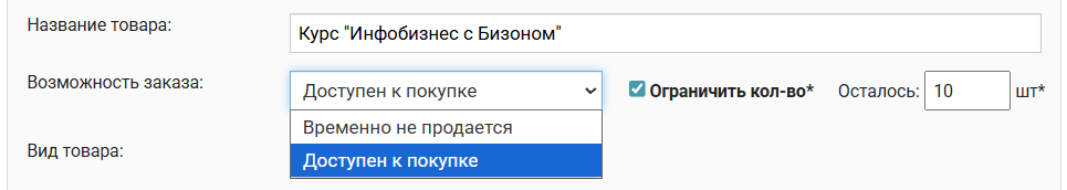 Если товар есть в наличии, и вы хотите начать продажи прямо сейчас – выбирайте режим «Доступен к покупке». Если товар временно не продаётся, выбирайте соответствующий пункт меню.
