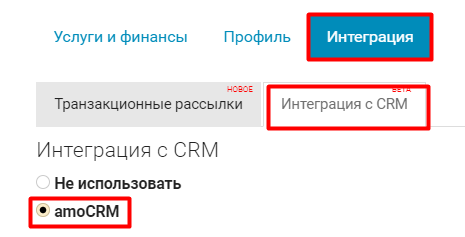 Перейдите в раздел Интеграция во вкладку Интеграция с CRM. Выберите amoCRM.