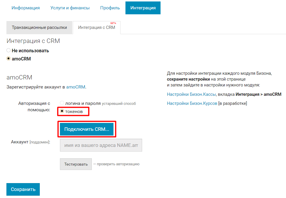 настройки Бизон Кассы, вкладка Интеграция → amoCRM.