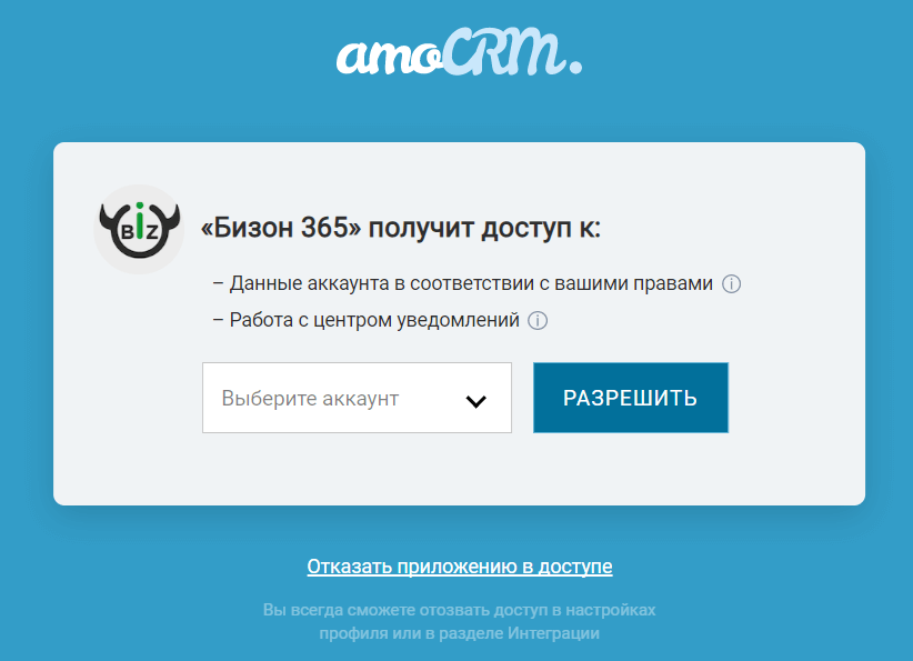 В следующем окне выберите аккаунт и Разрешите доступ к нему Бизону 365. Если вы авторизовались в аккаунте amoCRM до начала интеграции, то попадете на страницу с данным окном сразу после нажатия кнопки Подключить CRM, минуя предыдущее.