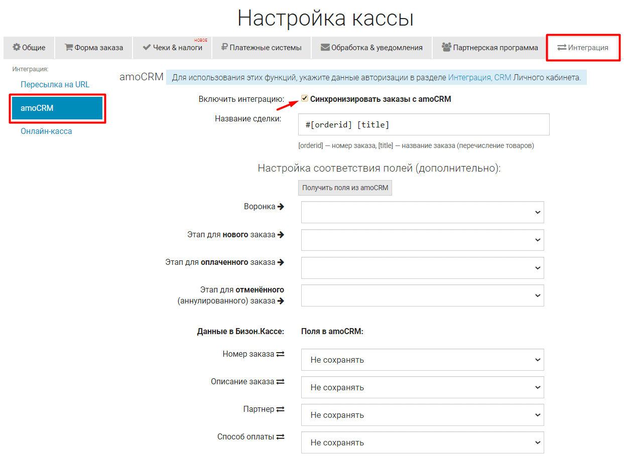 Настройте соответствие полей Бизон.Кассы и amoCRM.