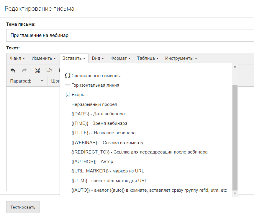 • {{TITLE}} — название вебинара (подставляется название комнаты)