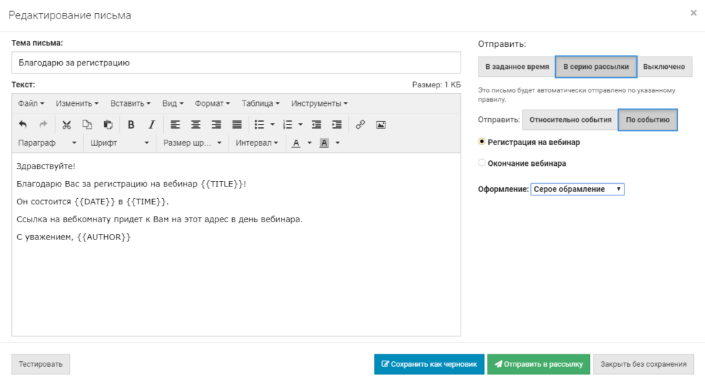 1.  Относительно события — выберите день и время отправки.  Событием в этом случае является дата и время вебинара.