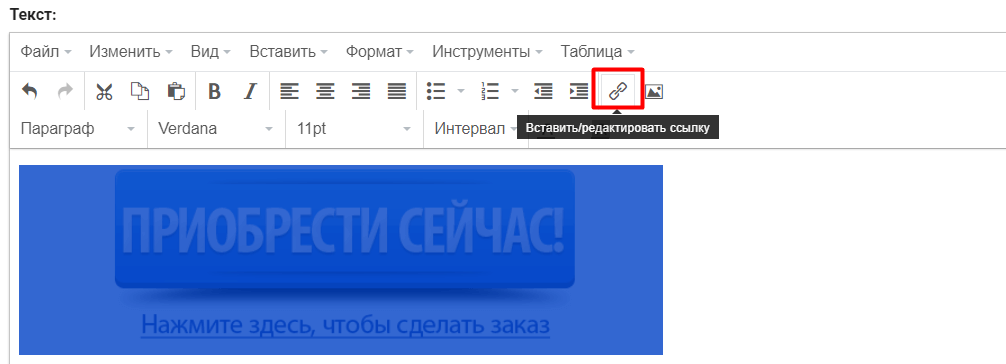 • нажмите кнопку Вставить/редактировать ссылку и заполните поля в окне, которое откроется