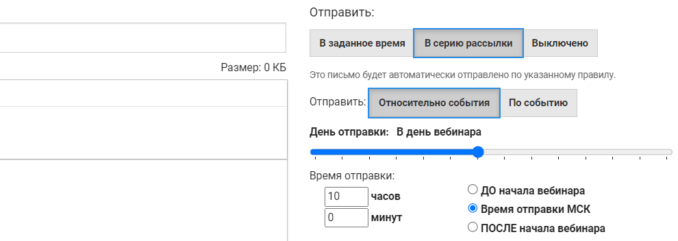 Если выбран день отправки “В день вебинара”, то для времени отправки возможен один из вариантов: