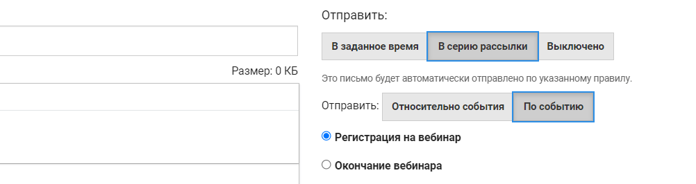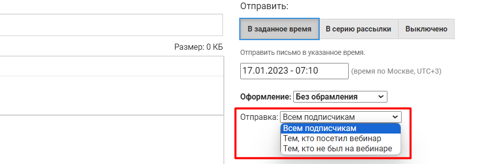 В заданное время и В серию рассылки → Относительно события доступен еще один параметр, с помощью которого можно регулировать, кому именно отправить письмо. Всем подписчикам (выбрано по умолчанию), тем, кто посетил или не посетил вебинар.