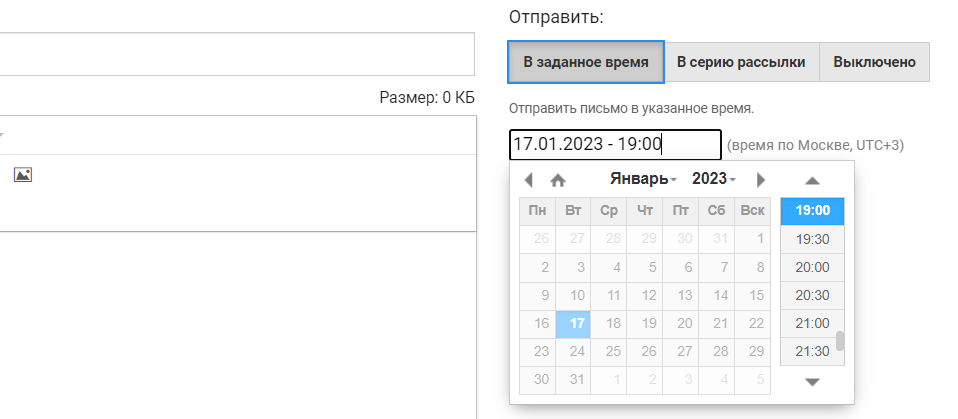 Если выбран режим В заданное время, укажите время отправки. Для этого щелкните на поле и выберите дату, как показано на скриншоте: