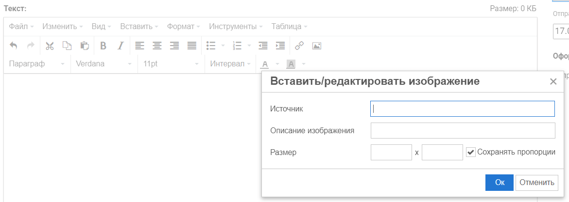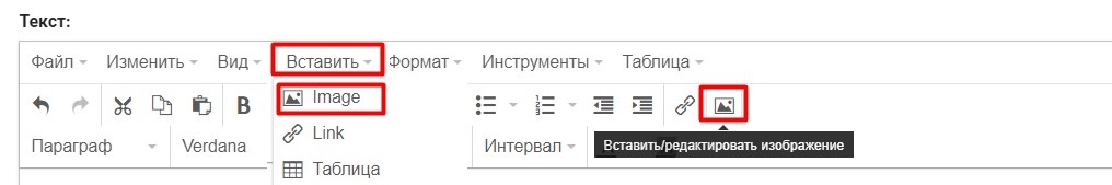 Чтобы добавить картинку в текст письма, во вкладке Вставить выберите Image или нажмите на кнопку Вставить/редактировать изображение.
