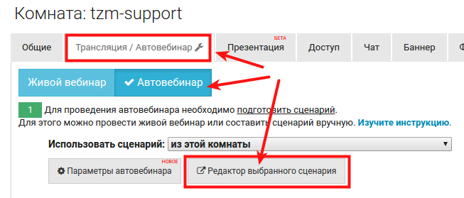 Чтобы экспортировать или импортировать сценарий перейдите в Редактор сценария. Для этого в настройках комнаты перейдите на вкладку Трансляция / Автовебинар → режим Автовебинар и нажмите кнопку Редактор выбранного сценария.