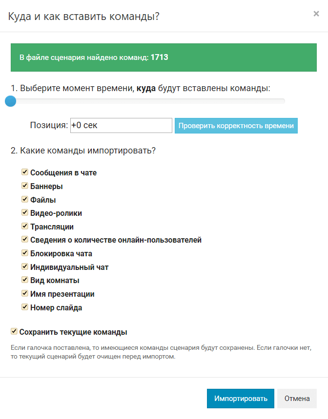 Можно вставить несколько сценариев из разных файлов. Для этого при новом импорте не снимайте галочку с опции Сохранить текущие команды.