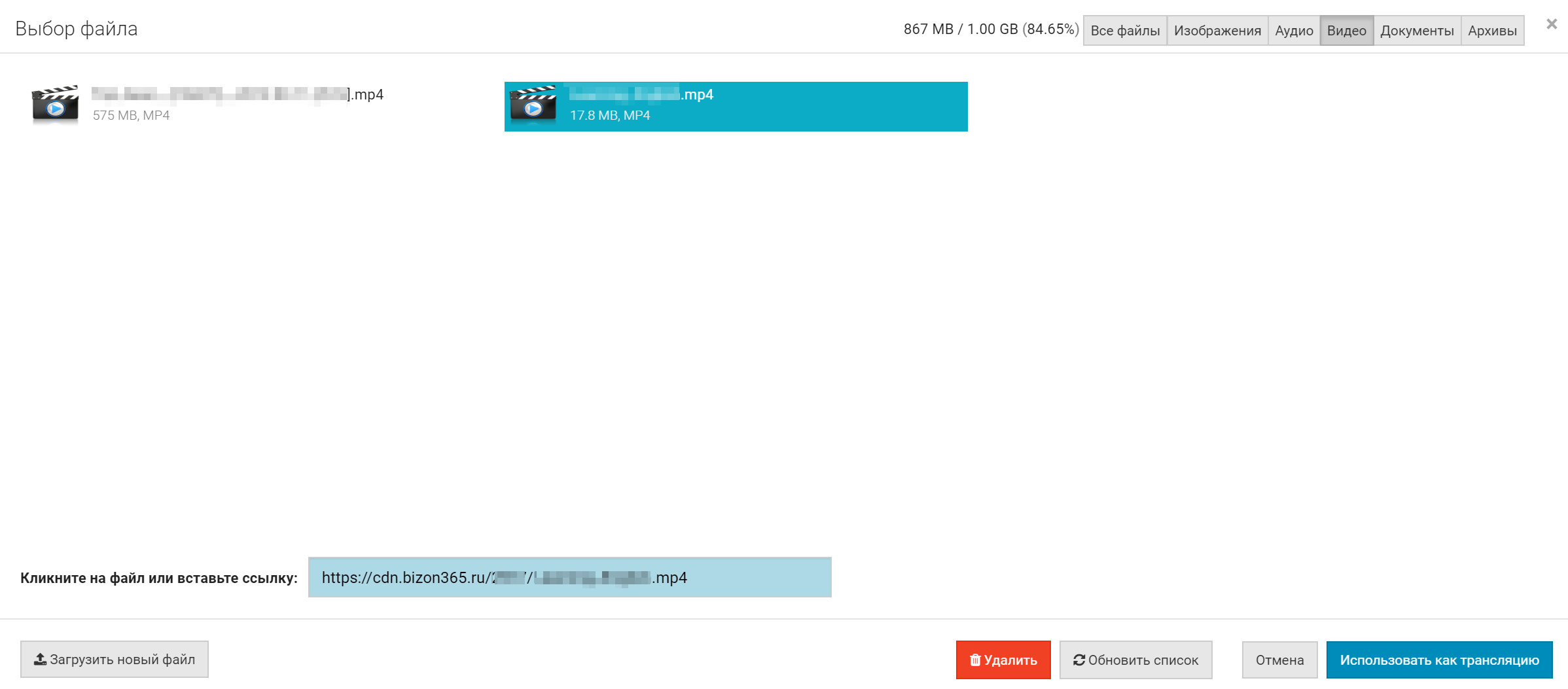 Для воспроизведения используются видеофайлы, загруженные в Хранилище сервиса. Напомним, что Хранилище состоит из двух частей: Диска и Облака. Поэтому и воспроизвести видео через Бизон Трансляции можно двумя способами: