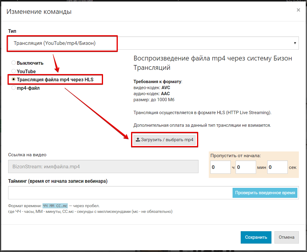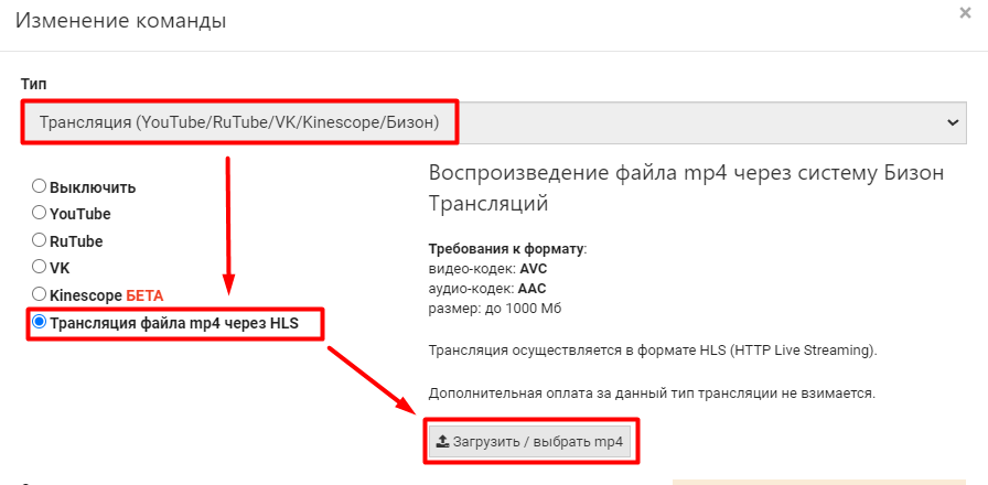 Создайте команду с типом Трансляция (YouTube/RuTube/VK/Kinescope/Бизон), выберите Трансляция файла mp4 через HLS и нажмите кнопку Загрузить / выбрать mp4: