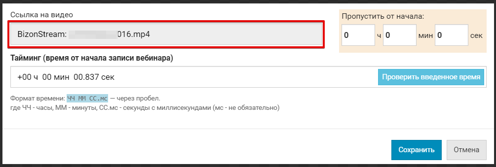 После этого в окне для ссылки вы увидите следующую надпись BizonStream:FileName.mp4: