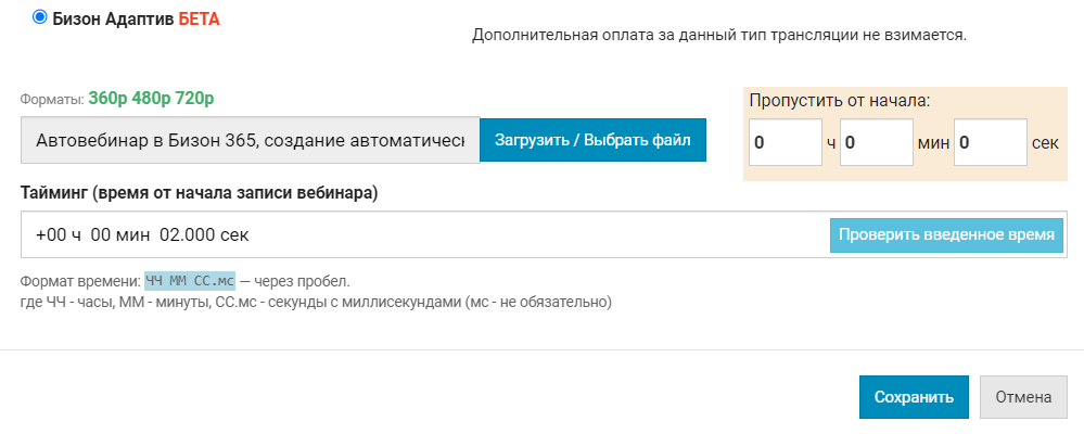 - Если вы проводили живой вебинар с использованием Бизон Трансляции и не забыли в настройках комнаты включить опцию Сохранять запись трансляции, то видео уже будет на Диске. Даже, если размер сохраненного файла более 3 Гб, его можно использовать в автовебинаре. Но обязательно убедитесь, что во вкладке Форматы созданы все модификации. В ином случае, запустите их создание самостоятельно.
