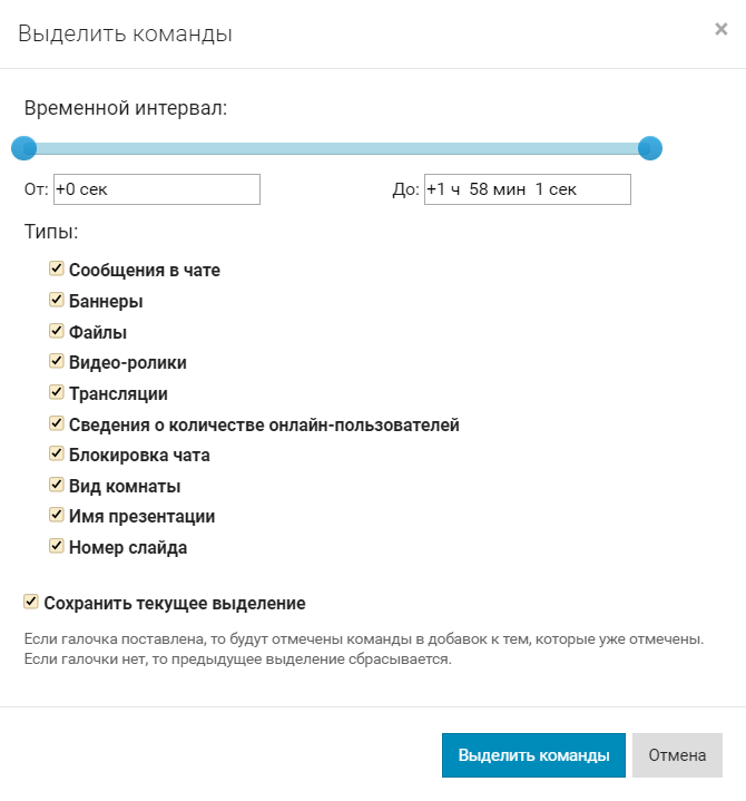 Нажмите на кнопку Выделить команды. В появившемся окне выберите интервал времени, который следует рассматривать, и типы команд.