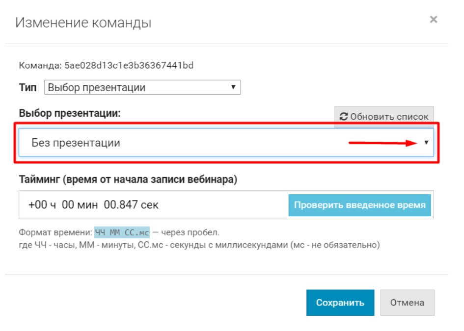 Если презентация была загружена с другим названием, необходимо будет внести изменения в команду “Выбор презентации”. Перейдите в редактор сценария автовебинара. Откройте команду "Выбор презентации" по кнопке Изменить. В открывшемся окне выберите нужную презентацию.
