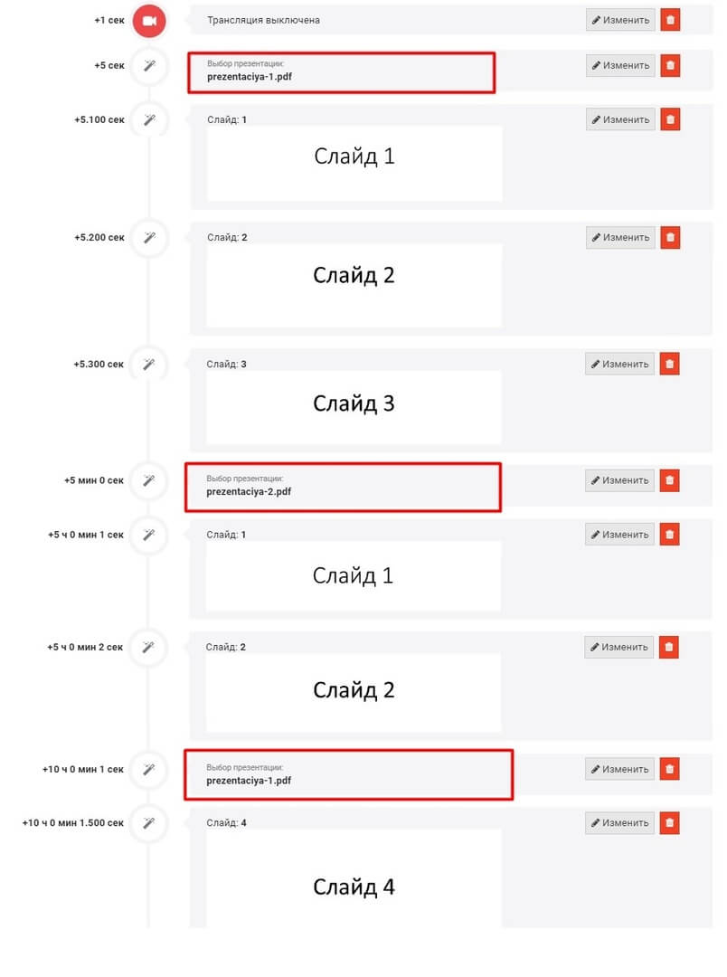 Создайте необходимое количество команд "Номер слайда" и укажите в них номер и время появления слайда во время автовебинара.