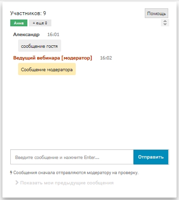 Для команды Сообщение необходимо выбрать, кем оно было отправлено: гостем или модератором. Внешний вид в чате будет отличаться следующим образом: