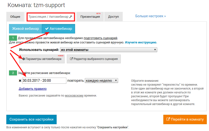 Задаем расписание и параметры автовебинара