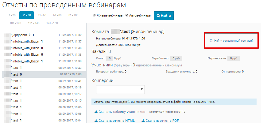 Отчеты. Выберите нужный вебинар и нажмите "Найти сохраненный сценарий".