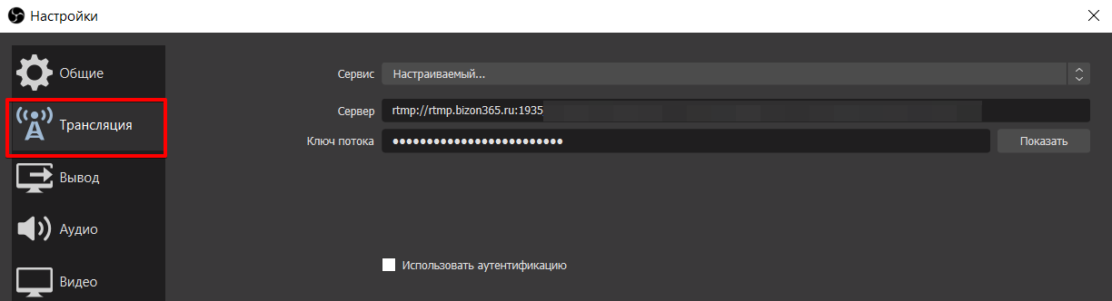 Снова выберите Файл → Настройки → Трансляция. Здесь нужно будет выбрать сервис и вставить ключ потока. Например, если трансляция проводится с YouTube, то в поле Сервис укажите YouTube - RTMPS. Где взять ключ потока рассказывается в инструкции к выбранному способу трансляции: