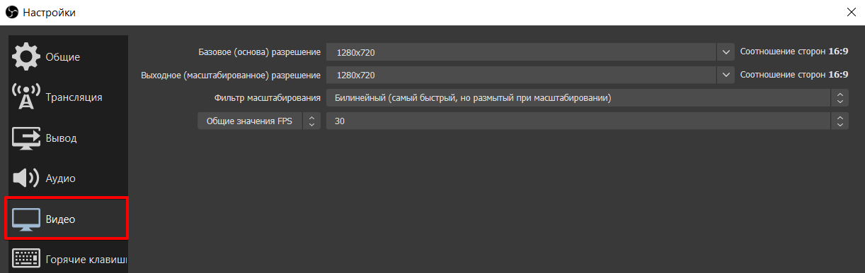 Затем перейдите на вкладку Видео. Рекомендуем установить Базовое и Выходное разрешение не более 720p, а лучше 480p либо 360p. Фильтр масштабирования должен быть Билинейный, а частота кадров не более 30.