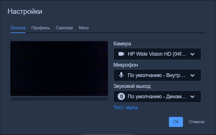 Во вкладке Devices вы можете проверить камеру и микрофон, провести тест звука.