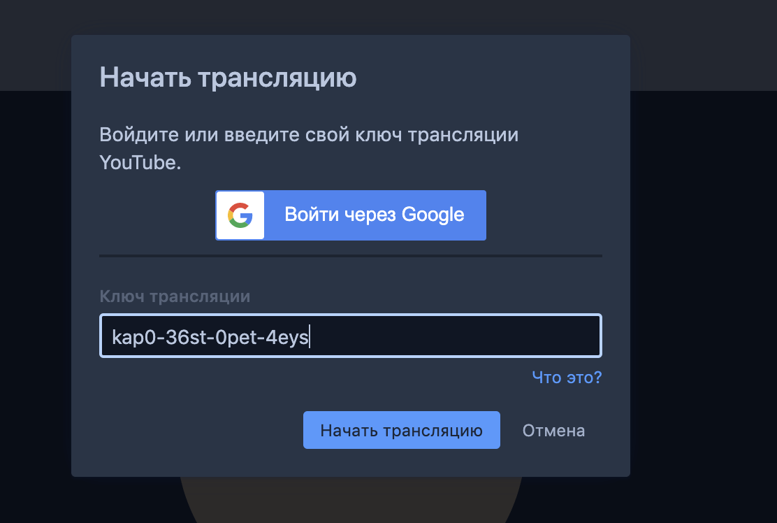 В открывшемся окне вставьте ключ трансляции, который вы сохранили ранее при создании трансляции YouTube и нажмите кнопку Начать трансляцию.