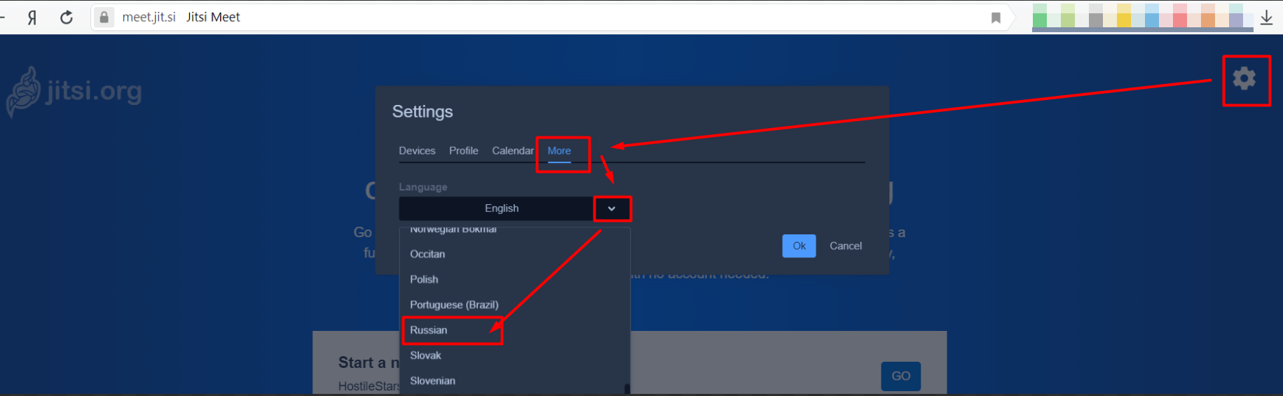 Для переключения интерфейса сервиса на русский язык нажмите на изображение шестеренки в правом верхнем углу. В открывшемся окне настроек перейдите во вкладку More. Из выпадающего списка выберите Russian.