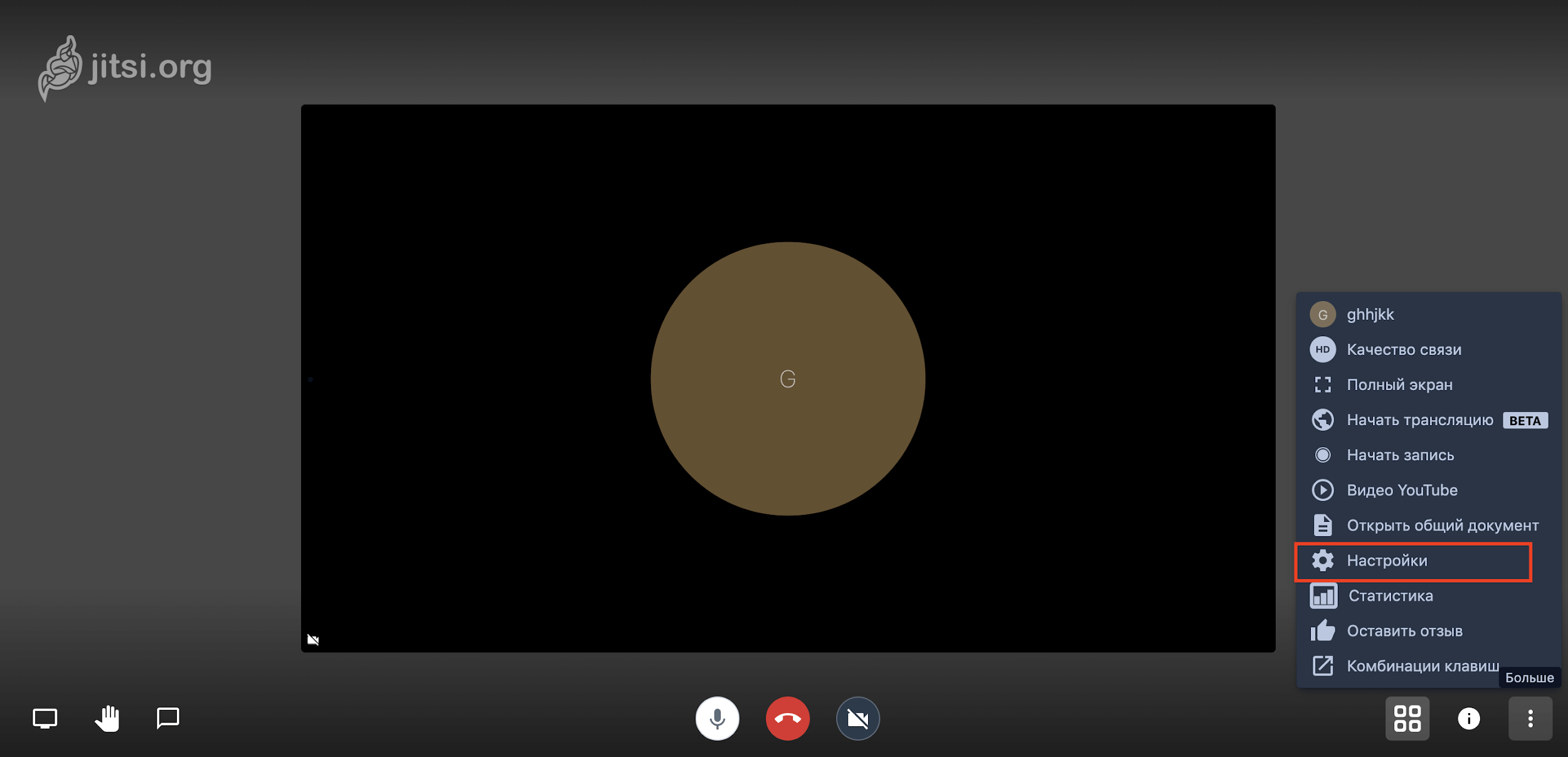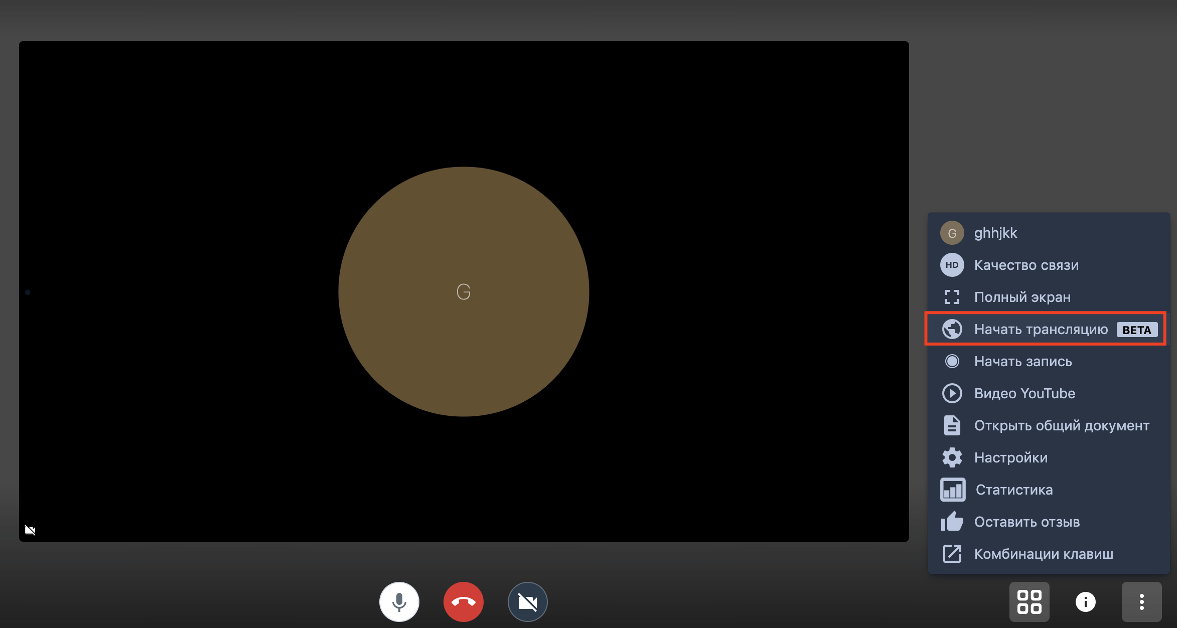 Чтобы завершить трансляцию в окне Meet Jitsi нажмите на красную кнопку с изображением телефонной трубки.