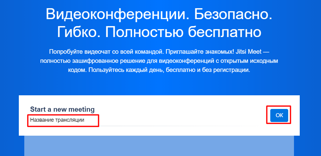 Не создавайте трансляцию с простым и популярным названием, например, Test или Проверка. Название трансляции подставляется в ссылку. Если другие пользователи Meet Jitsi указали такое же название, то они переходят по той же ссылке и, соответственно, попадают в одну конференцию с вами. В окне трансляции могут появиться посторонние.