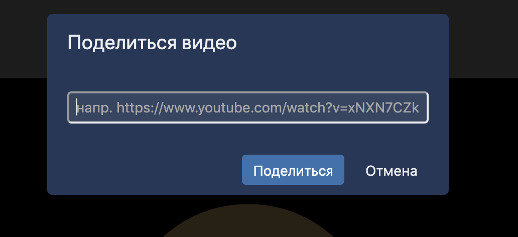 Вставьте ссылку на нужное видео в открывшемся окне и нажмите кнопку Поделиться.