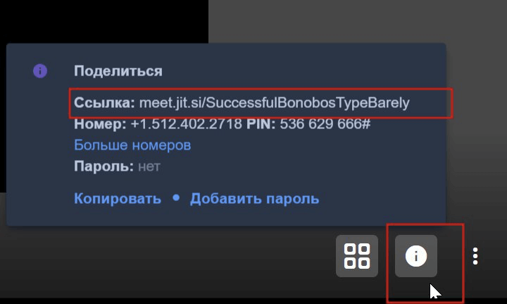Нажмите на кнопку с буквой i. Скопируйте ссылку и отправьте спикеру. Он сможет присоединиться к трансляции в 1 клик.