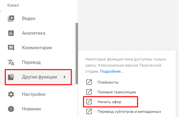 Чтобы соединить трансляцию с каналом YouTube, в этом же меню нажмите Начать трансляцию.