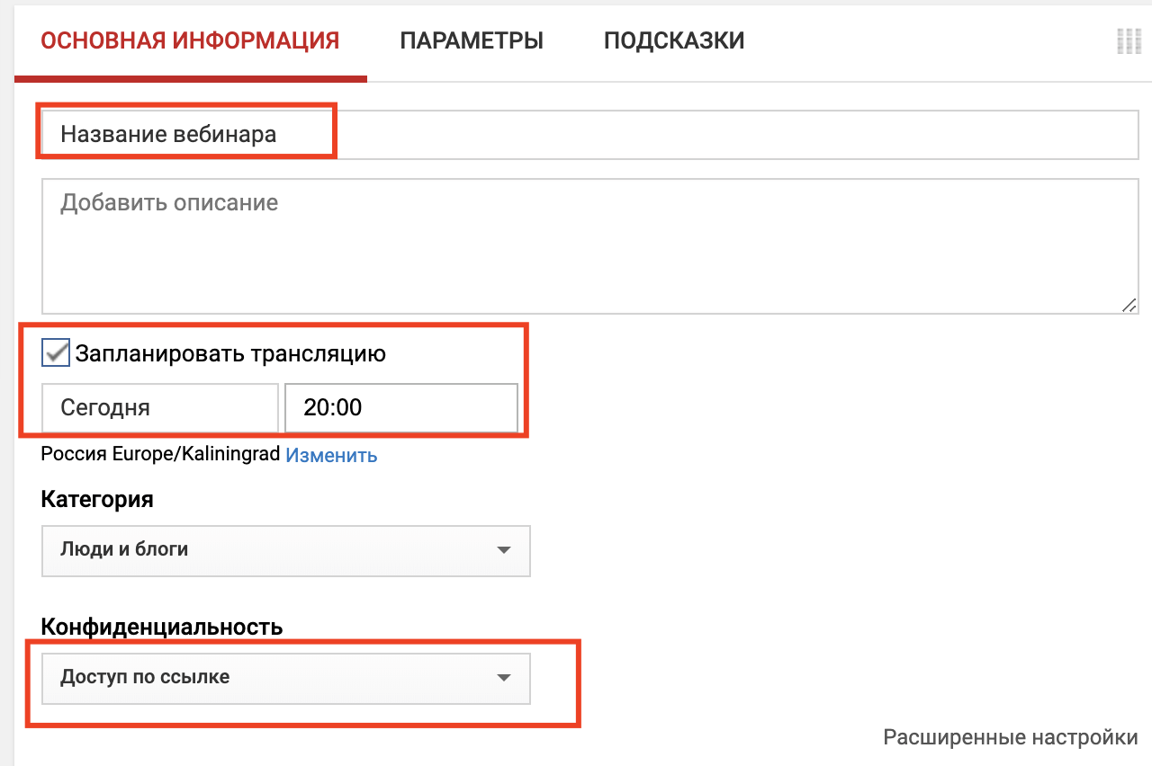 Запланируйте трансляцию, заполнив необходимые поля. Обратите внимание, должен быть выбран Доступ по ссылке.