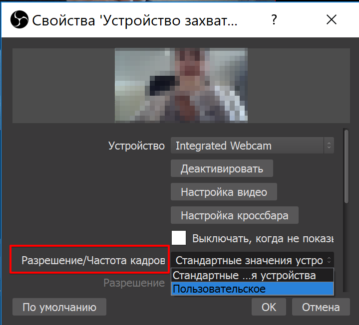 Нажмите ОК и в появившемся окне выберите нужную камеру. Также выберите Разрешение и частоту кадров. Можно установить пользовательское значение, как показано на скриншотах ниже.