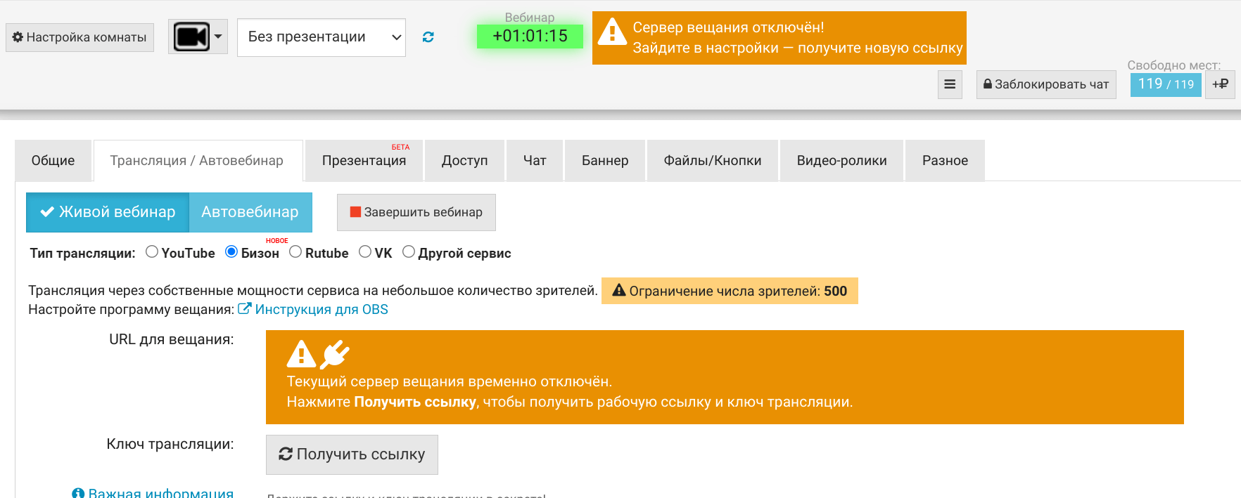 Если в комнате появилось оповещение об отключении сервера вещания, откройте настройки комнаты и, не завершая вебинар, нажмите кнопку Получить ссылку.