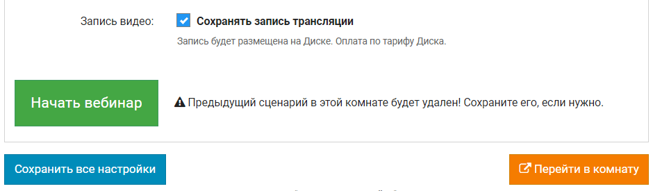 Вернитесь в настройки комнаты и нажмите кнопку Начать вебинар и Перейти в комнату.