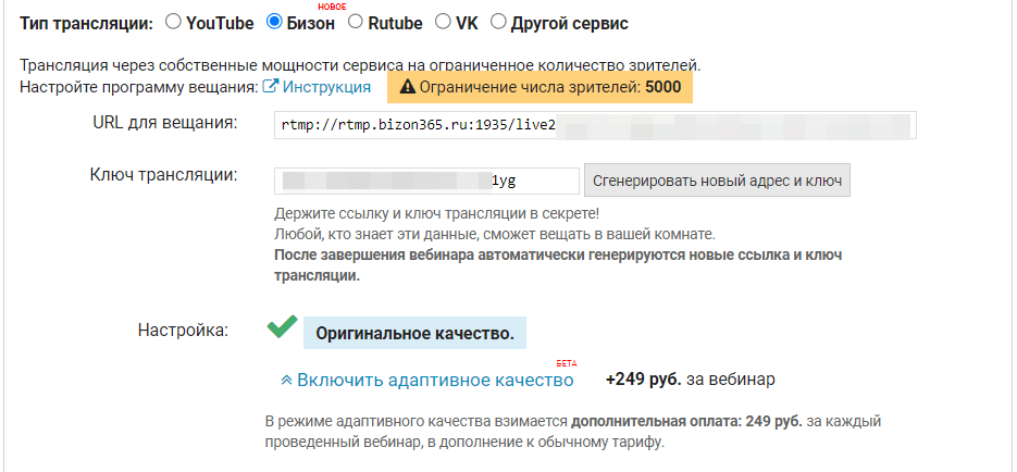 Оригинальное качество: видео в вебинарной комнате будет воспроизводиться в одном единственном формате, заданном параметрами видеокодера.
