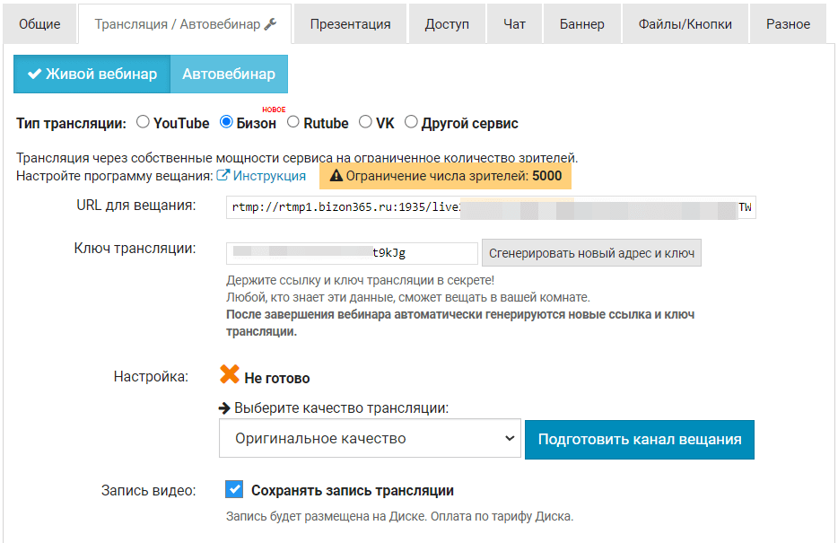 Запись трансляции будет сохраняться на Bizon.Диск.