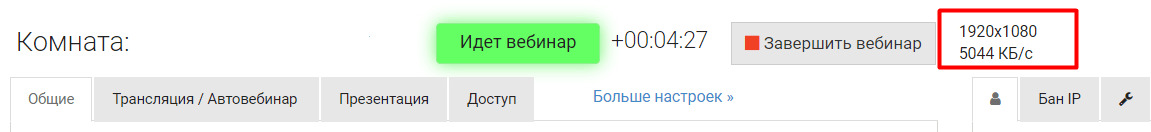 Во время вебинара можно отслеживать битрейт вашей трансляции в настройках комнаты