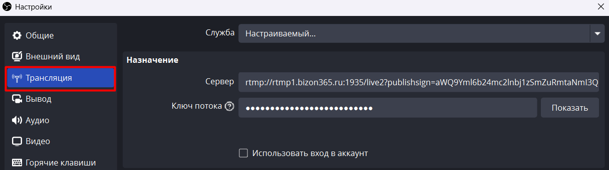 Перейдите в Настройки OBS Studio - Трансляция. Выберите Служба - Настраиваемый. Скопируйте из настроек комнаты в Бизоне URL для вещания и вставьте в поле Сервер, а в поле Ключ потока - Ключ трансляции.